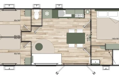 Mobil-home 35 m², équipé de 3 chambres et 1 salle de bain, tout équipé
